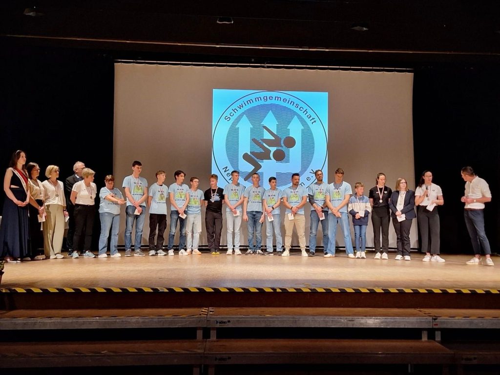 Neben vielen Vereinen der Spargeltstadt wurden auch 21 Schwimmer*innen und zwei Trainerinnen der SG Neptun für ihre Leistungen im vergangenen Jahr ausgezeichnet. So erreichte die Herrenmannschaft bei den DMS 2024 einen Aufstieg in die erste Bezirksliga. Diese Leistung vollbrachten Maximilian S., Leonard W., Ksawier K., Fynn K., Nicolas G., Neo C., Mika S., Jayden B., Tim Ue., Paul P. und Henrik N. mit tatkräftiger Unterstützung der Trainerinnen Uschi B. und Christel M.. Weiterhin konnten die Lampertheimer Schwimmer auch mit ihren Einzelleistungen überzeugen. So konnten sich Sebastian S., Maximilian, Leonard, Hannah und Maria M., Kira S., Henrik, Christel, Svenja S.und Claudia Ue. bei Hessischen Meisterschaften durchsetzten und einige Platzierungen erschwimmen. Tom W. vertrat Lampertheim erfolgreich auf den Süddeutschen Freiwassermeisterschaften und auch die Leistungen von Henrik N. auf den Deutschen Mastersmeisterschaften lassen sich aufzeigen, dort erreichte er zwei mal das Podest.