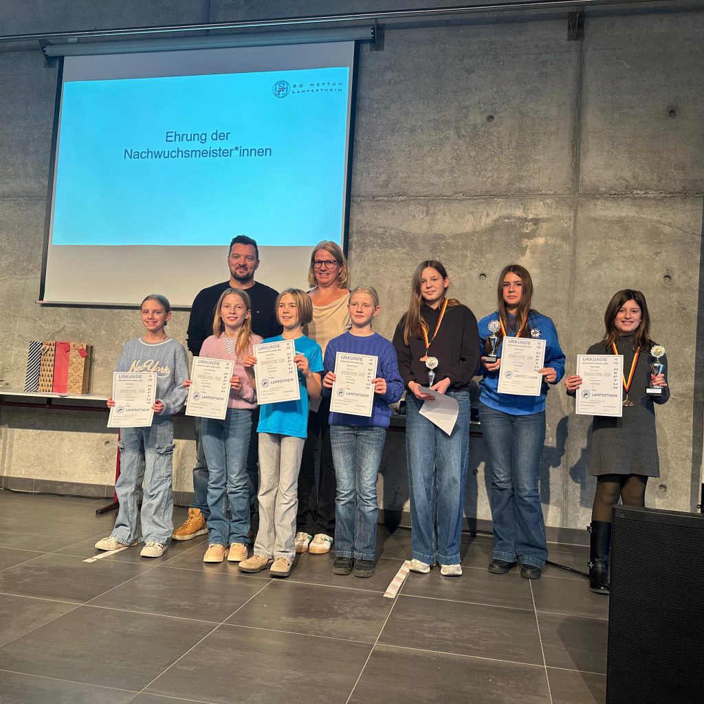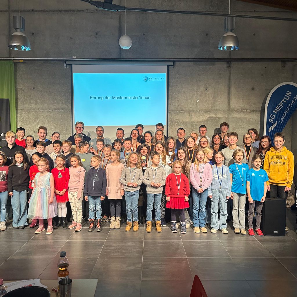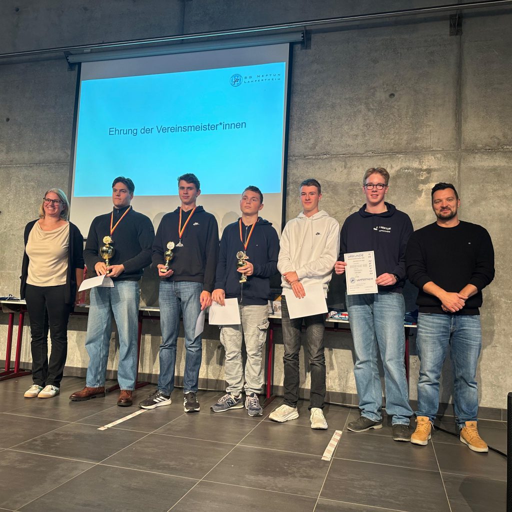 Neben den Jubilaren wurden auch die Ergebnisse der Vereinsmeisterschaften geehrt, so freuten sich alle Schwimmerinnen über Urkunden in den Jahrgangswertungen. Auch wurden die drei großen Wertungen, die Nachwuchs-, Masters- und Vereinsmeisterwertung geehrt. Zum Starten in der Nachwuchswertung mussten die Schwimmerinnen (Jahrgang 2013 und jünger) auf den 100m Lagen und zwei 50m Strecken Punkte sammeln und wurden in der Summer dieser verglichen. Bei den Mädchen konnte Helena Platz (Jg. 2014) die Wertung vor Lucia Jacobi (Jg. 2013) auf Platz zwei und Magdalena Molitor (Jg. 2013) auf Platz drei für sich entscheiden. Bei den Jungen siegte Sebastian Süssner (Jg. 2013) vor Marc Wruck (Jg. 2015) auf Platz zwei und Julian Krizak (Jg. 2013) auf Platz drei. In der Masterswertung dürfen Schwimmerinnen ab der Altersklasse 20 (Jg. 2005 und älter) mit den gleiche. Vorraussetzungen wie in der Nachwuchswertung starten. Bei den Damen gewann Doreen Steinborn (Jg. 1977) vor Svenja Sabo (Jg. 1971) auf Platz zwei und Kira Scholz (Jg. 2002) auf Platz drei. Henrik Nieter (Jg. 1982) entschied das Rennen der Herren für sich vor Paul Przyklek (Jg. 1984) auf Platz zwei und Benjamin Medert (Jg. 1997) auf Platz drei. In der Vereinsmeisterwertung starteten die Schwimmerinnen auf der doppelten Distanz. Maria Mörstedt und Tim Uebach (beide Jg. 2004) konnten die jeweilige Wertung für sich entscheiden. Auf Platz zwei schwammen Hannah Mörstedt (Jg. 2004) und Nicolas Greulich (Jg. 2009) und Platz drei konnten Lia Lorenz (Jg. 2010) und Leonard Wruck (Jg. 2012) erreichen. Wir gratulieren allen Sportler*innen zu diesen Ergebnissen.